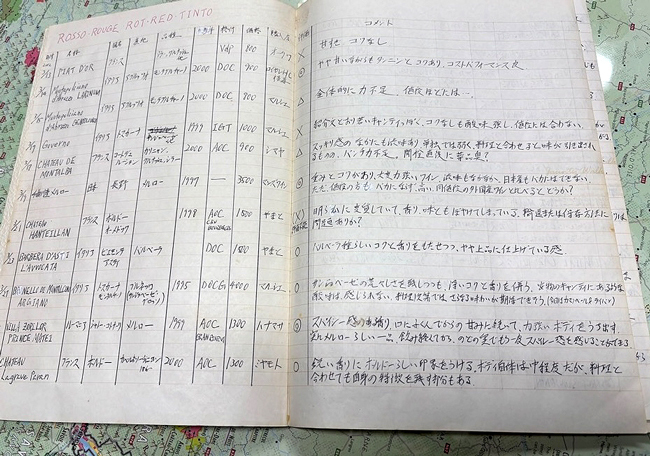 淡野:いやいや私の趣味です(笑)。こういう記録を付けるのが好きなんですよ。同じものをうっかり買わないように、飲んだワインについて2年くらいはノートに記入していました。どうせだったらいろんな種類を飲みたいから。で、また買ってもいいものには印を付けて、お金がない学生なりにどうやってマシなワインを飲むのか工夫していました。1本ずつは覚えていないですが、今でも売り場でラベルにいろんな言語で書かれた産地やブドウ品種を見て、このあたりのこういうワインだな、きっとこんな味かなという程度は一応、分かります。