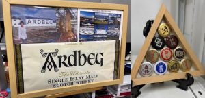 スコッチウイスキー蒸留所へも見学に足を運ぶなど、趣味のお酒も調査・研究の姿勢で楽しむ。広島のお酒の王冠で作ったオブジェなど、嗜好がうかがえるコレクションも発見